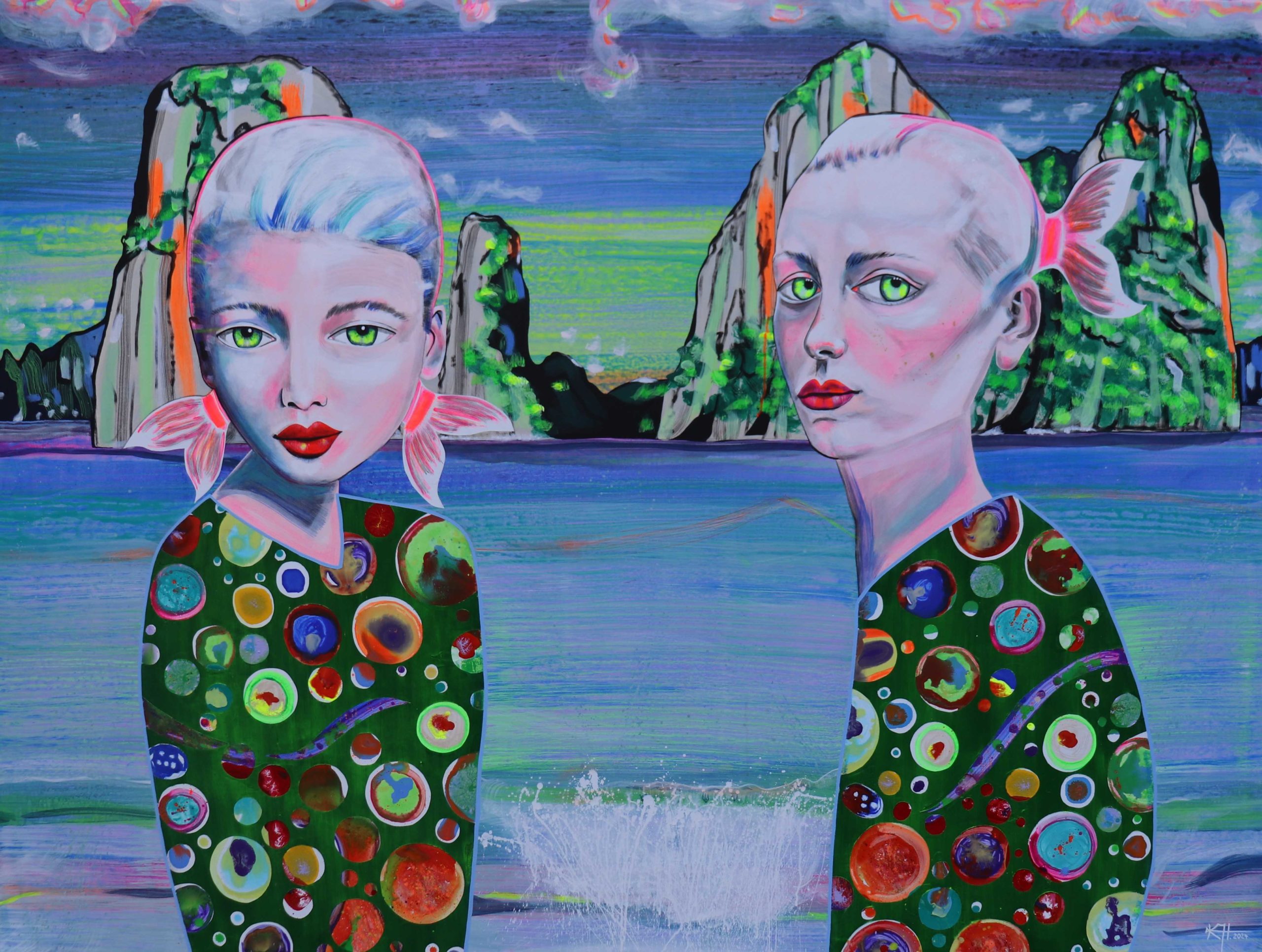 Mit der Ausstellung „Im Moment der Stille“ öffnet die Künstlerin einen neuen, atmosphärischen Zugang zur Verbindung zwischen Mensch und Natur. Im Titelbild der Ausstellung löst sich die Grenze zwischen Mensch und Natur: Zwei Körper, halb Mensch, halb Wasser, zwischen Blick und Bewegung. Natur ist nicht Kulisse, sondern Teil des Selbst.
